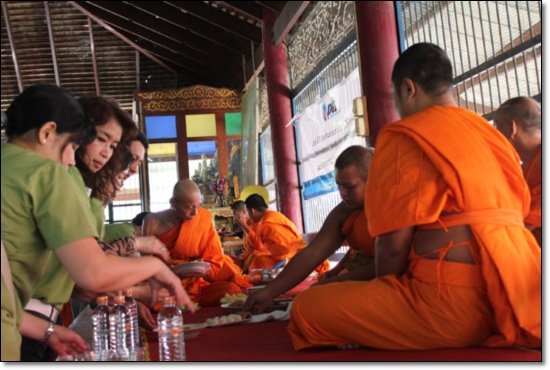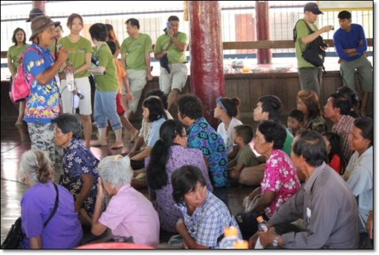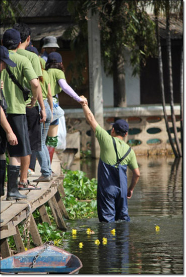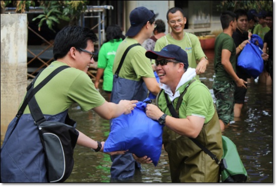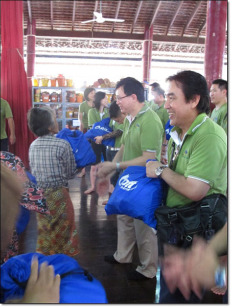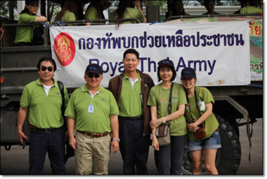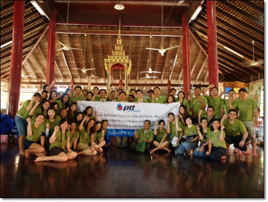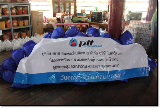 Dr. Chitrapongse Kwangsukstith, Chairman of PTT International Company Limited, and Khun Chatchawal Eimsiri, Acting President, led the management and staff to help over 250 families of flood victims at Suwannaram Temple Community in Sa La Ya, Phutthamonthon, Nakorn Pathom.  We started with food offering to monks and merit-making ceremony before giving a lunch treat to the flood victims.  In the afternoon, the management and staff presented the flood victims the survival bags containing items that truly met their needs as well as EM balls.  Some senior management and staff also took a boat trip to flooded houses to give away survival bags while other staff helped clean Suwannaram Temple.  In addition, we cooperated with Phutthamonthon Hospital in setting up a mobile medical clinic to do basic physical checkup for the participating flood victims.