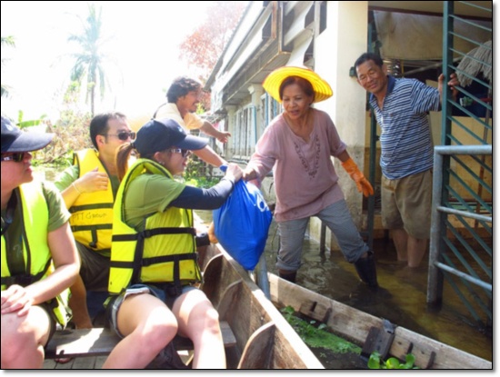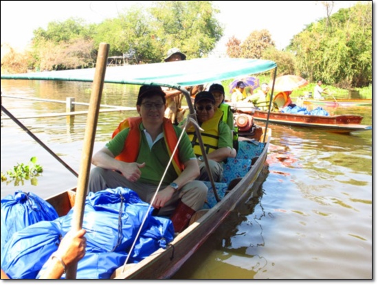 Dr. Chitrapongse Kwangsukstith, Chairman of PTT International Company Limited; Khun Chatchawal Eimsiri, Acting President, and Khun Pariyanuch Saekow, Vice President – Strategic Planning & Investment, took a boat trip to flooded houses to give away survival bags.