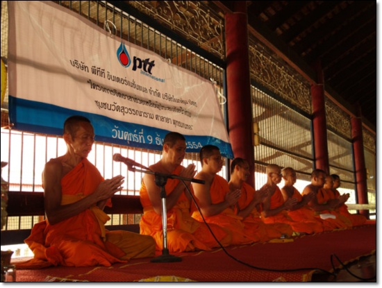 Khun Manoon Narasodsai, Head of Suwannaram Temple Village, was giving a welcome remark to the management and staff of PTT International Company Limited.